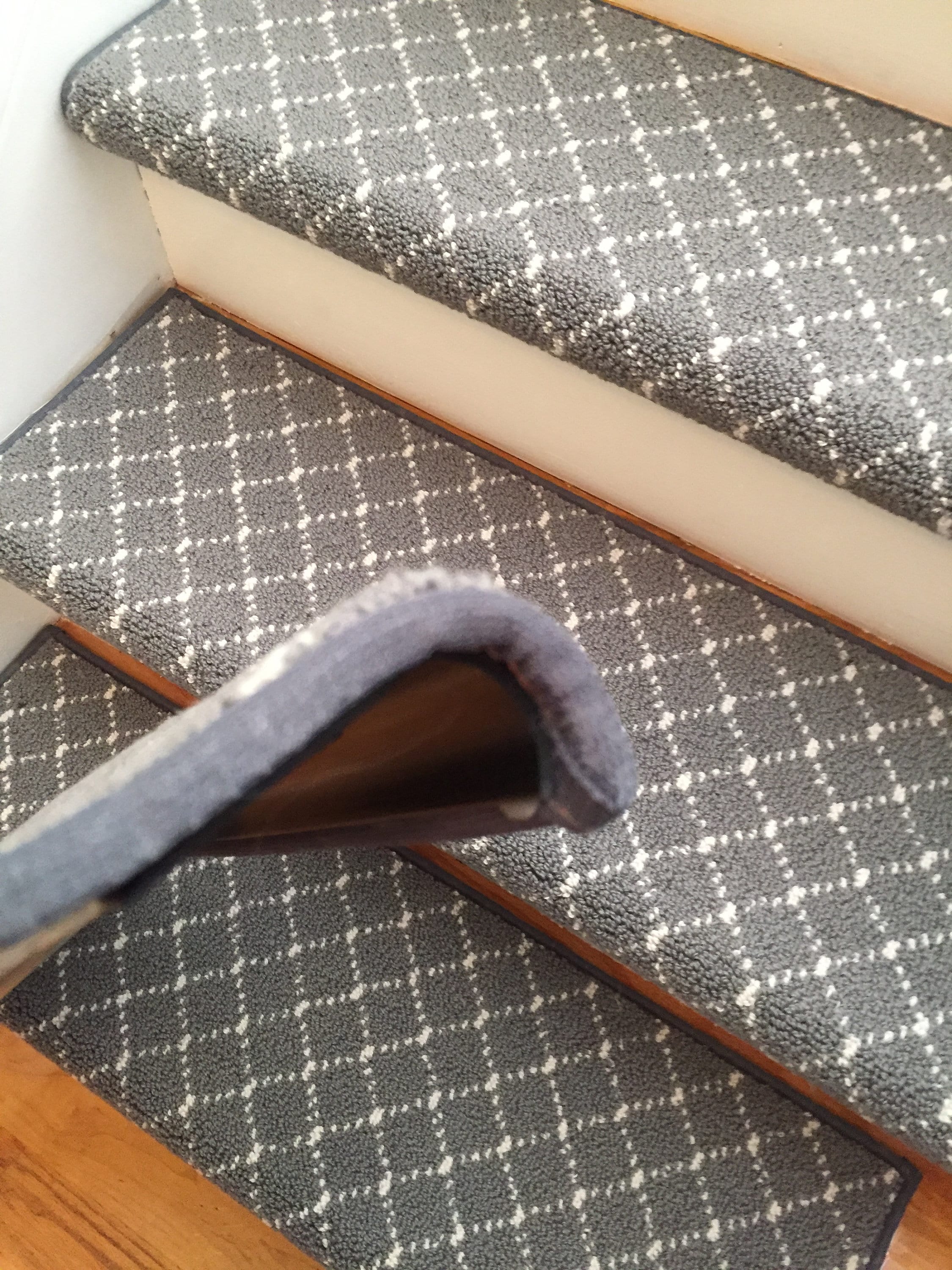 We start with this awesome 100% New Zealand Wool carpet, cut it down to the correct tread size, seam the boarders and then permanently attach our True Bullnose® rigid edge.